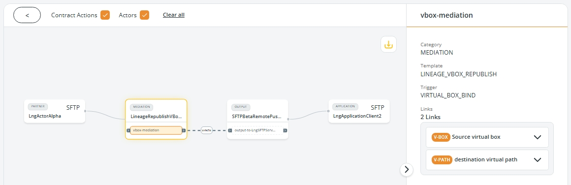 By clicking mediation-vBoxBind in the lower part of the box, the Category, Template, Trigger, and links of the contract connection, with all the details, are shown.