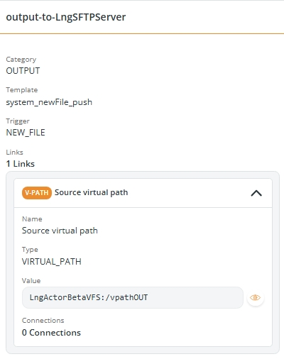 By clicking output-to-LngSFTPServer in the lower part of the box, the Category, Template, Trigger, and links of the output contract, with all the details, are shown.
