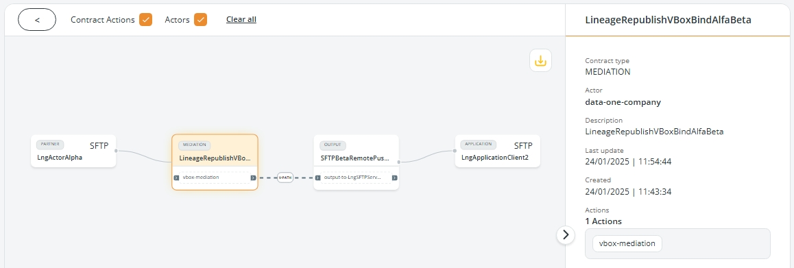 The same logic applies to the OUTPUT box. By clicking the OUTPUT upper part of the box, the Contract type, Actor, Description, Last update, and Creation date, together with the action, are shown.