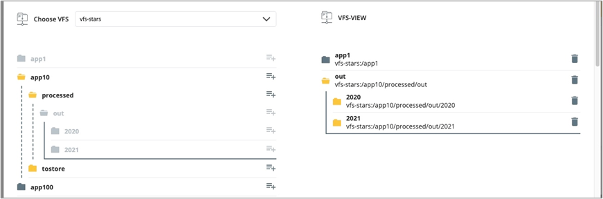By clicking the NEW VFS VIEW button, you can create a special view of the VFS so that the actor will see a specific subset of the folders belonging to the VFS β and not the full VFS. Moreover, separate VFS can be selected to create one single VFS that will aggregate all the selected folders.