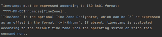 The final section provides information about timestamp processing. It contains the format expected by the command line. It is the ISO 8601 with the optional TimeZone. If it is not set, the default of the operating system is used. Z indicates the absolute UTC format, but it can also be set in the hours:minutes format.