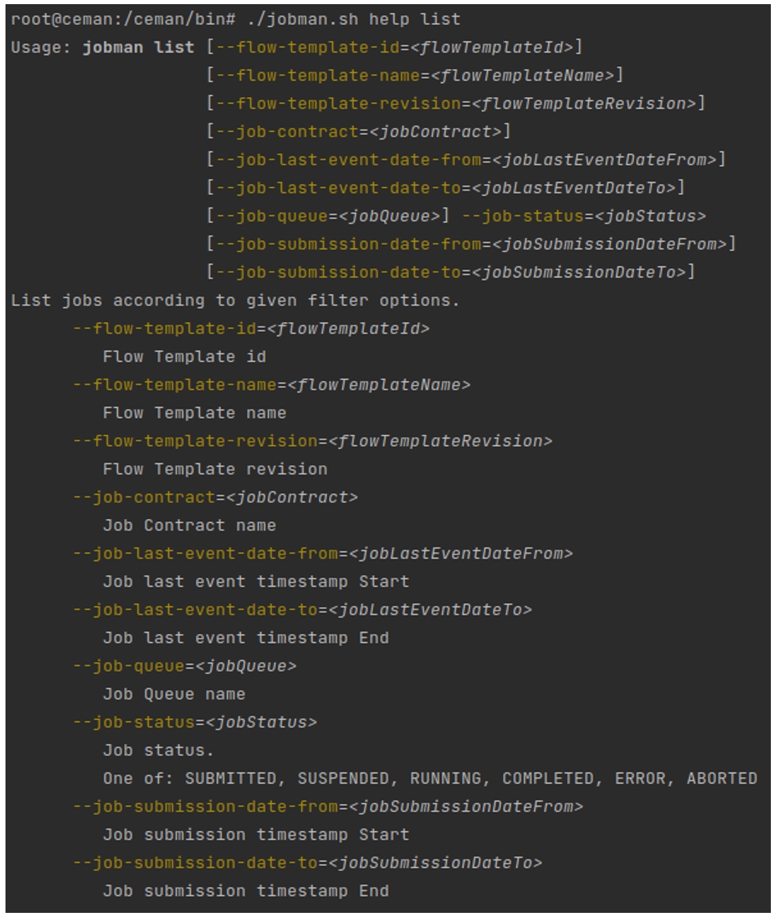 [COMMAND]: command to be executed. help is the command to display the help; execute-on-jobs is the command to execute actions on a list of jobs; list is the command for a list of actions. help + <command> provides information about the command. The picture below shows the result of the jobman.sh help list command: