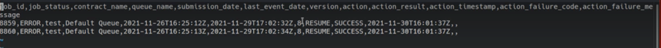 For the resume, abort and suspend actions, the job_id and version columns are mandatory. For the change-queue action, the job_id, version and change_queue_name columns are mandatory. For the abort-resubmit and resubmit actions, the job_id, version and resubmit_queue_name columns are mandatory.