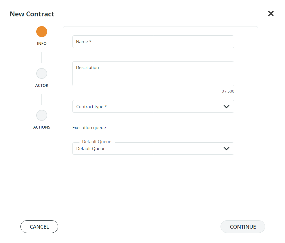 Execution Queue: by default, a contract is associated with a default queue. Queues order the tasks designed in the contract and define how they must be processed. To assign a contract to a different queue, open the drop-down menu and select another queue among those available. Details about queues can be found in the Job Queues section of this documentation.