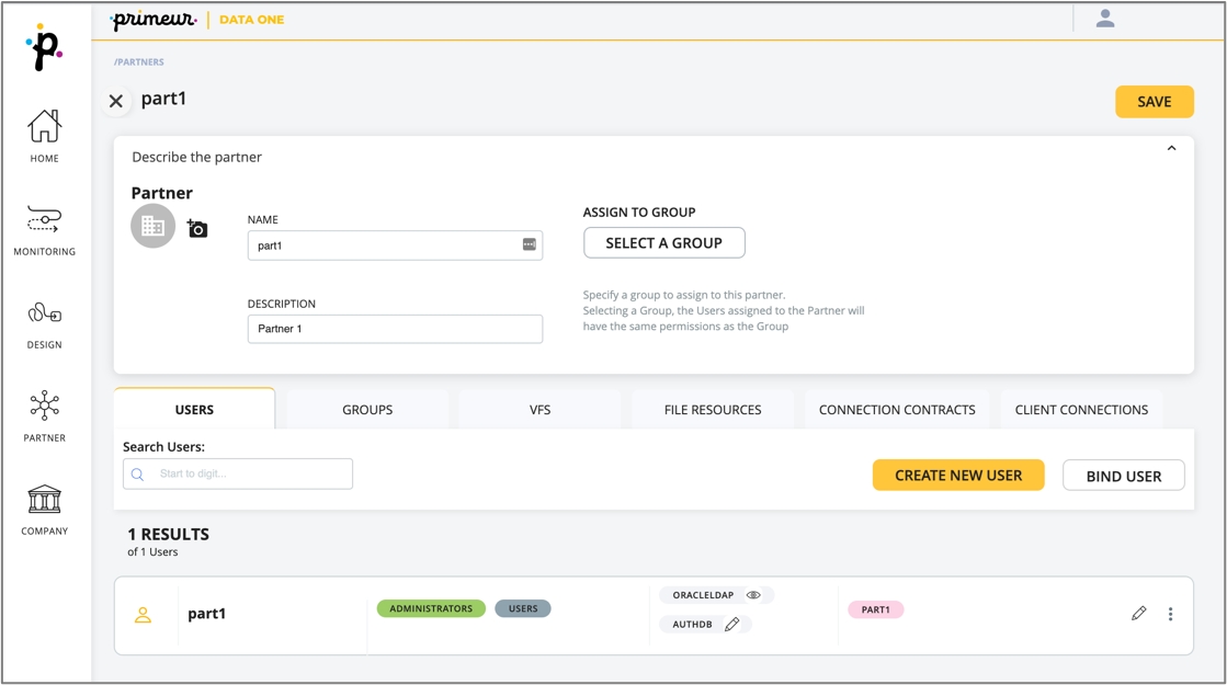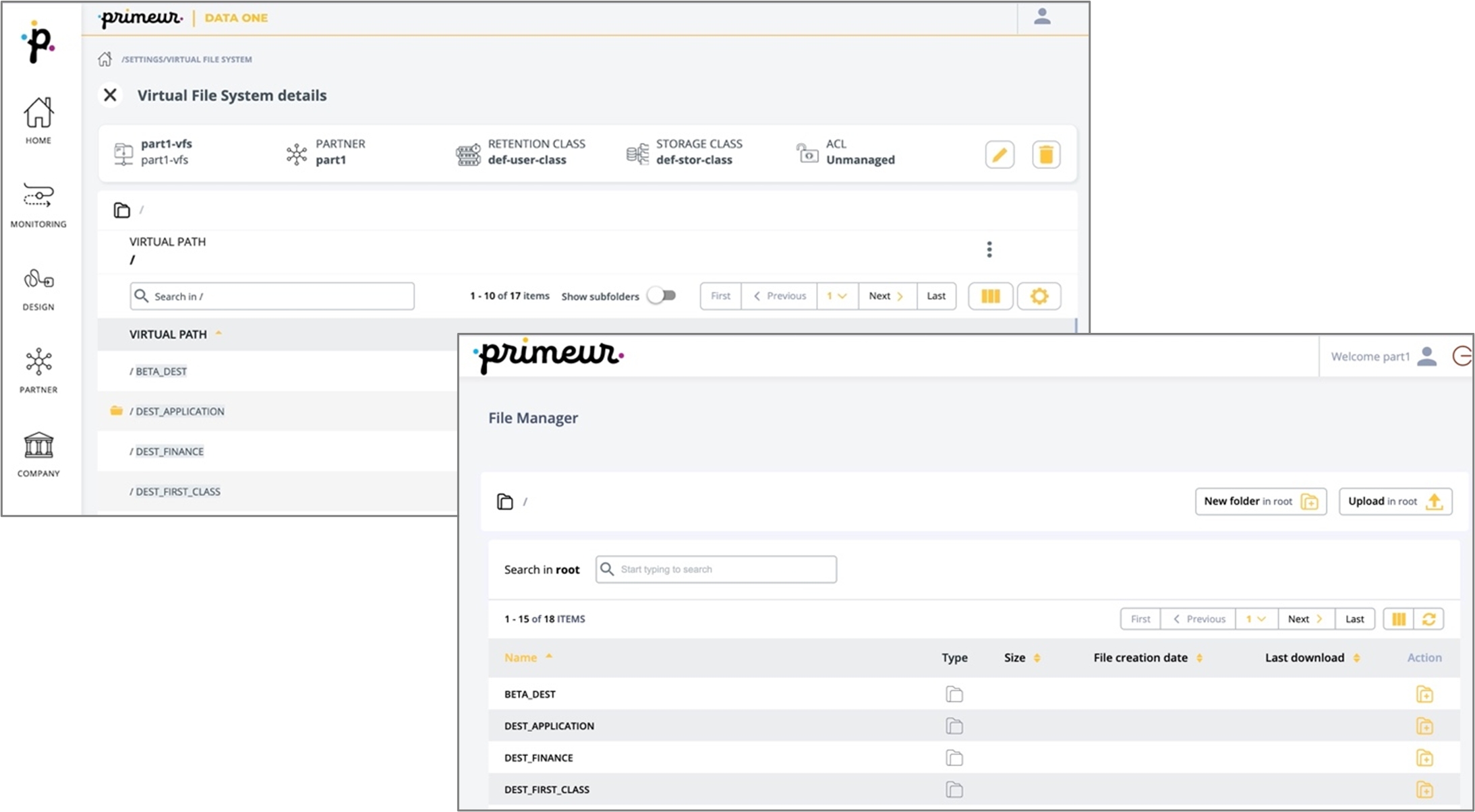 Files are shown both in File Manager and in Data One going to Monitoring → Search File by Actor and selecting the Partner and the VFS.