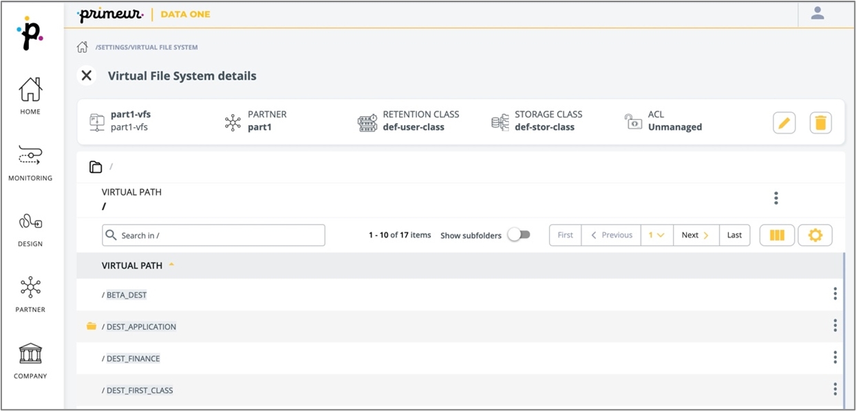 The structure of the folders listed in File Manager is the structure of the VFS associated with the Partner in Data One.
