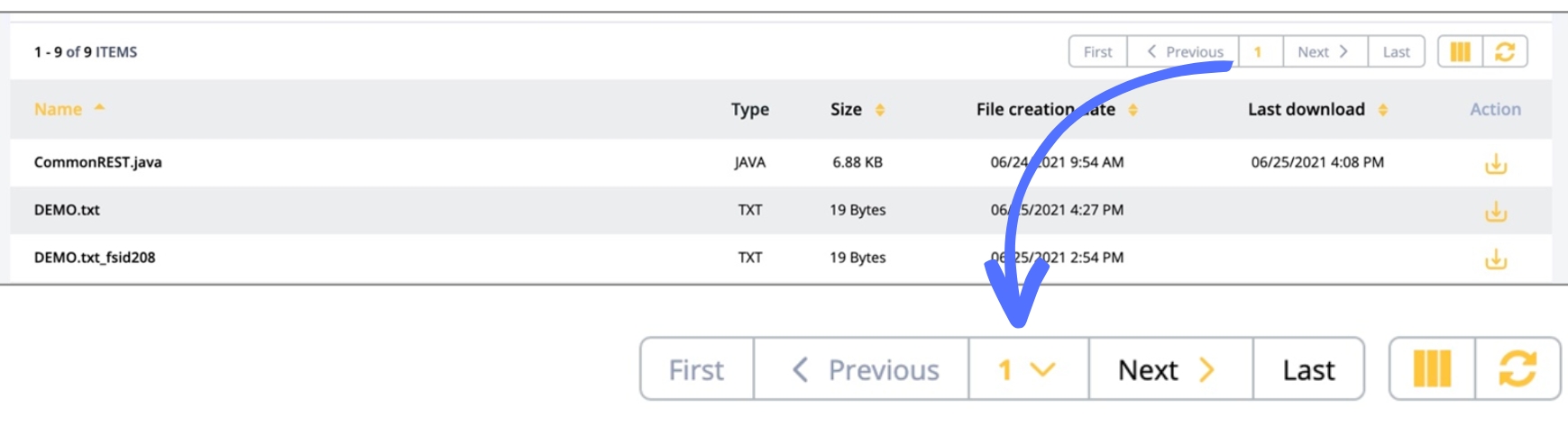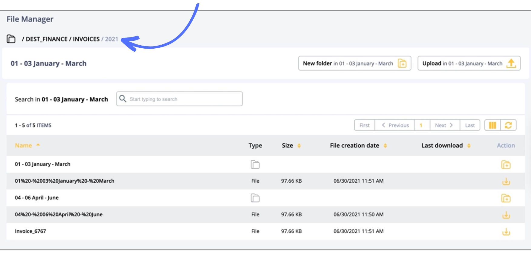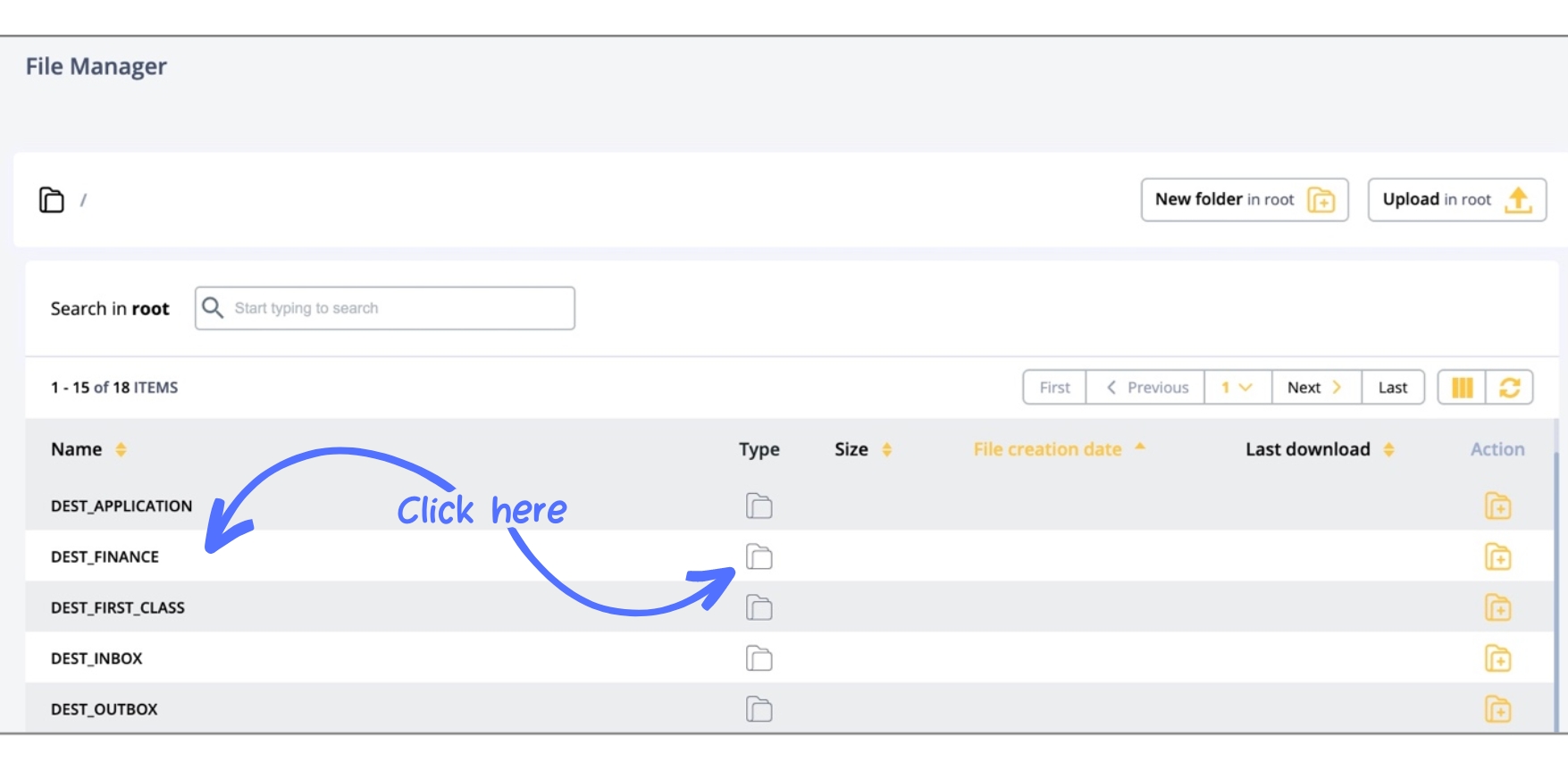 The Action column allows you to download files clicking the icon (or the filename in the Name column) and add folders clicking the