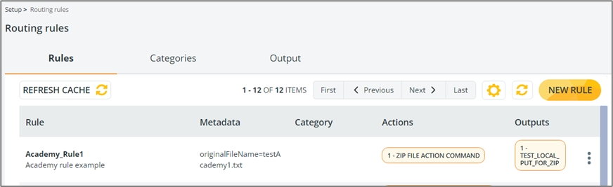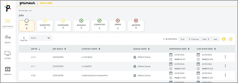 Once the file enters the system, the rule will be applied and the testAcademy1.zip file will be created. Going to Monitoring → Jobs, we can see that the AcademyRuleContractNewFile Contract is COMPLETED.