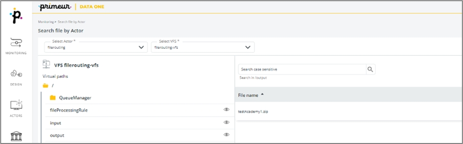 Going to Monitoring → Search File by Actor, we can see the testAcademy1.zip file in the output virtual path of the VFS.
