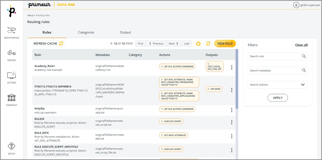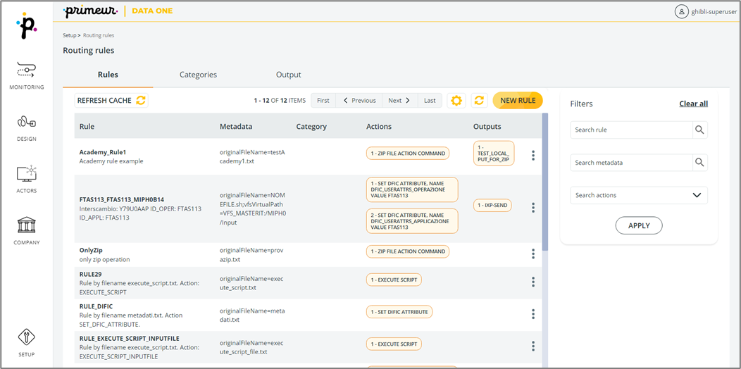In the Routing Rules page, you can create and manage Rules, Categories, and Outputs.