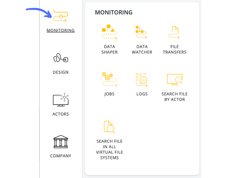 The main sections of the solution are displayed on the toolbar on the left side of the screen. The icons on the toolbar represent the Monitoring, Design, Actors, Company, and Setup menus. Hover over the icons to open panels featuring the different sections of PRIMEUR Data One 1.20.0.