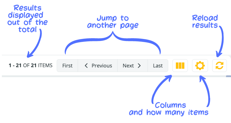 Most pages have the same layout with a toolbar at the top of a list of results. The toolbar is organized with a set of options that let you:
