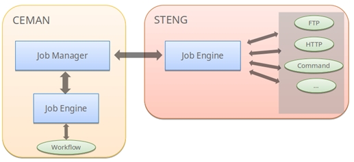The Job Manager component is deployed in the CEMAN. Workflow jobs are submitted to the CEMAN environment, which manages their execution and status changes.