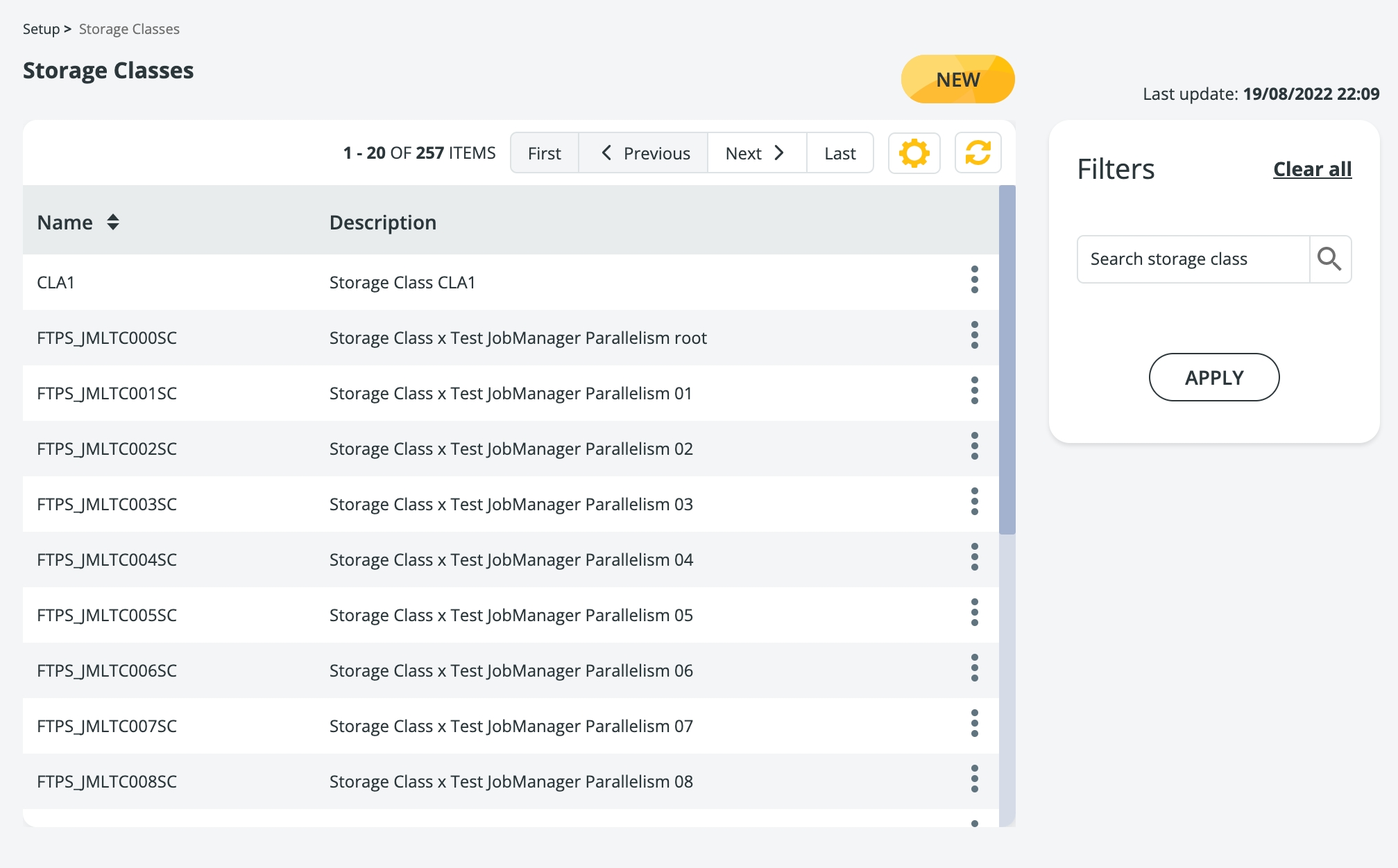 A Storage Class defines the physical storage where internal and external files must be stored when entering Data Mover. Moreover, it defines where incoming files must be temporarily stored before their transfer is completed.