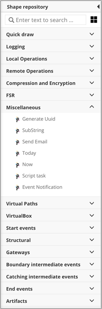 This panel contains all service tasks. To use them, simply drag the single service task from the Shape Repository panel and drop it on the working area.