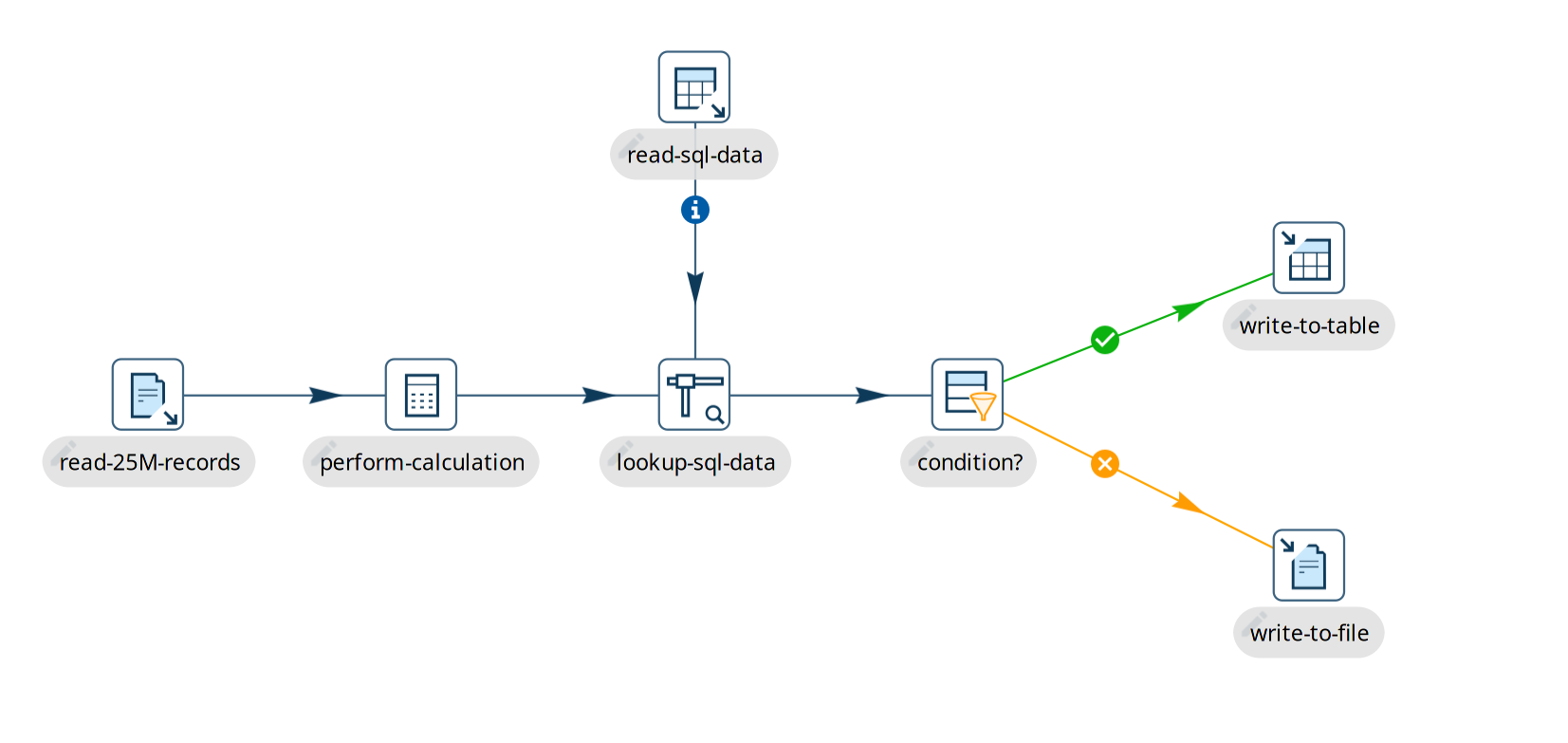 * the "read-25M-records" transform starts reading data from a file, and pushes that data down the stream to "perform-calculations" and the following transforms. Since reading 25 million records takes a while, some data may already have finished processing while we’re still reading records from the file.