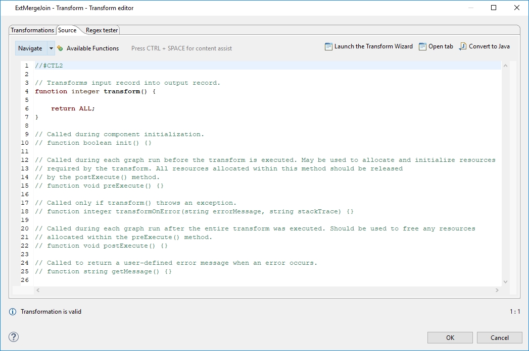Here is an example of how the Source tab for defining the transformation in CTL looks.