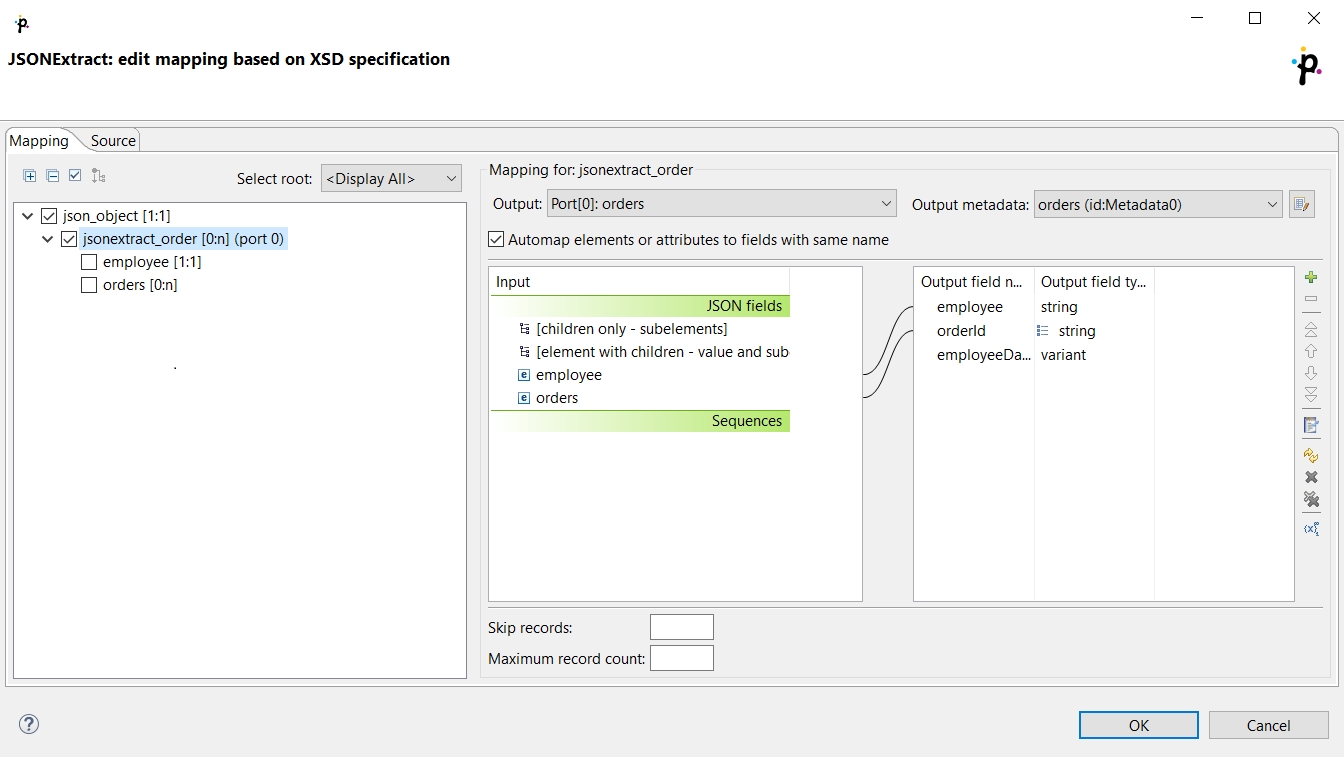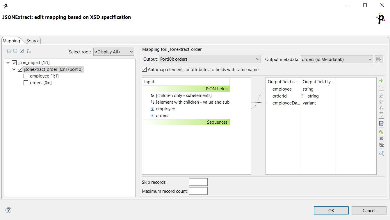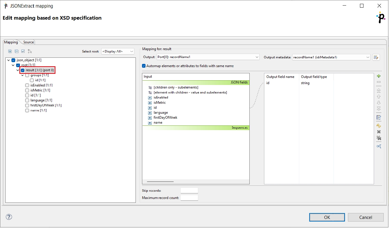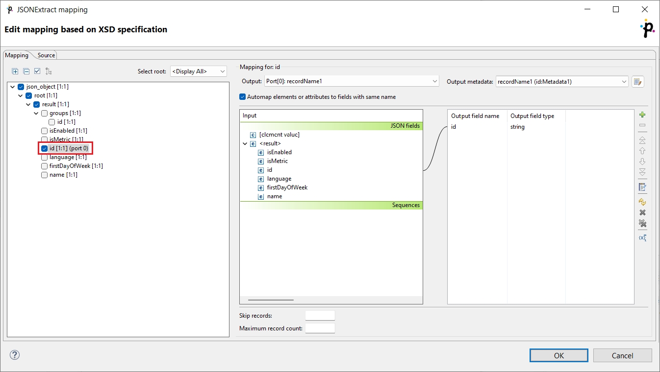 Mapping in JSONExtract is almost same as in XMLExtract. The main difference is, that JSON does not have attributes. For more information, see XMLExtract’s Details.