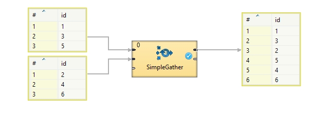 SimpleGather gathers data records from multiple inputs. The order of output records is unpredictable.