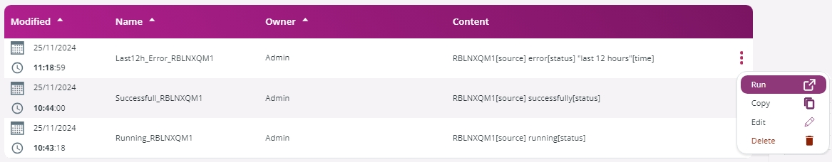 Saved queries can be run by going to Setup β Saved Queries (or go to Setup β Data Watcher section β Saved Queries when Data Watcher is in a bundle with Data Mover) and by clicking the Run menu. Results will be listed in the Dataflow Inquiry page.