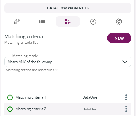 Once you have created a new Matching Criteria, this will appear in the Matching criteria list section of the Matching Criteria panel. By clicking on the 3 dots icon at the end of each result, you can Disable, Edit or Delete the Matching Criteria. The results in the list are related following the rules set in the Matching mode drop-down list: