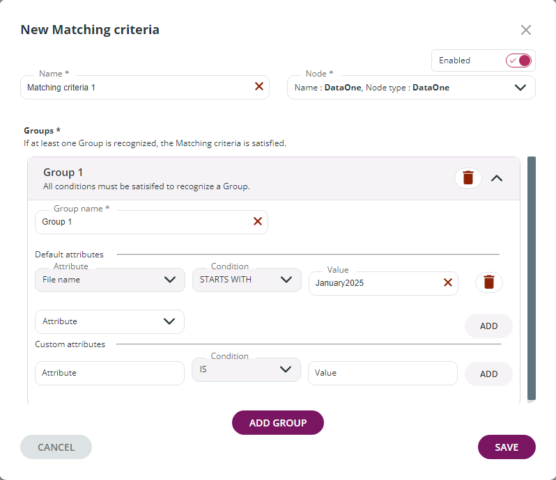 Enter a Name for your matching criteria and select whether the criteria will be enabled (default) or disabled upon creation.
