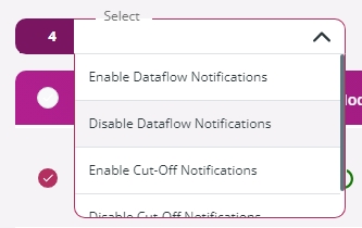 On the Dataflow Models page, by clicking the 3-dot icon on the right of the model and selecting Enable Dataflow Notifications or Disable Dataflow Notifications. If you select multiple models, multiple dataflow notifications can be set in one go by going to the Select drop-down menu and choosing the Enable Dataflow Notifications or the Disable Dataflow Notifications entry.