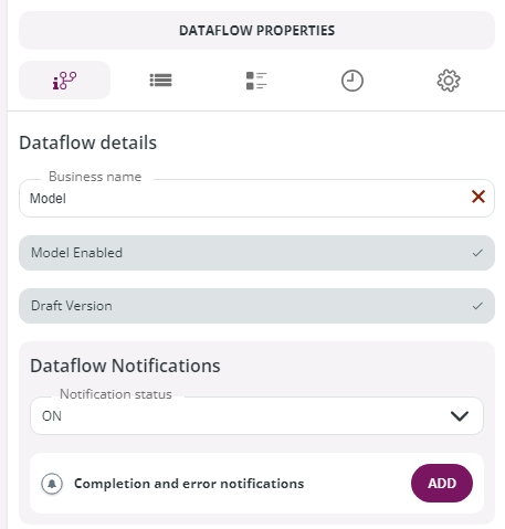 In the Dataflow Properties panel (available in Dataflow Models β New or Edit), go to the Dataflow Notifications box and click Add in the Completion and error notifications section.
