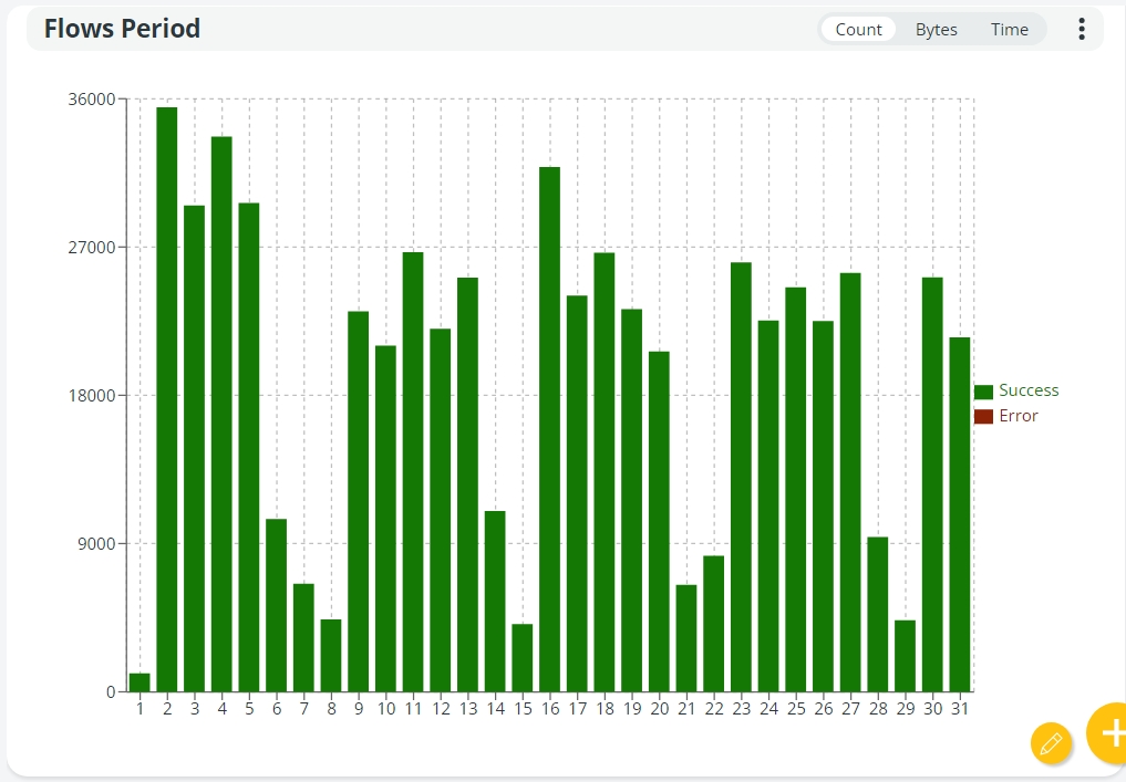 Given a time frame, the graph shows on the Y-axis the number of flows, or bytes, or the time it has taken to transfer flows, both successful, failed, and in error.